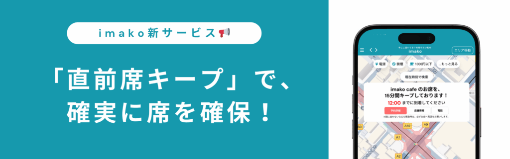 そこで、11月頃(予定)に新たにリリースするimakoアプリの新機能「直前席キープ」で、来店前に15分間席を確保できるようになります。「今すぐカフェに行きたい」その瞬間に、ワンタップで席を確保。
