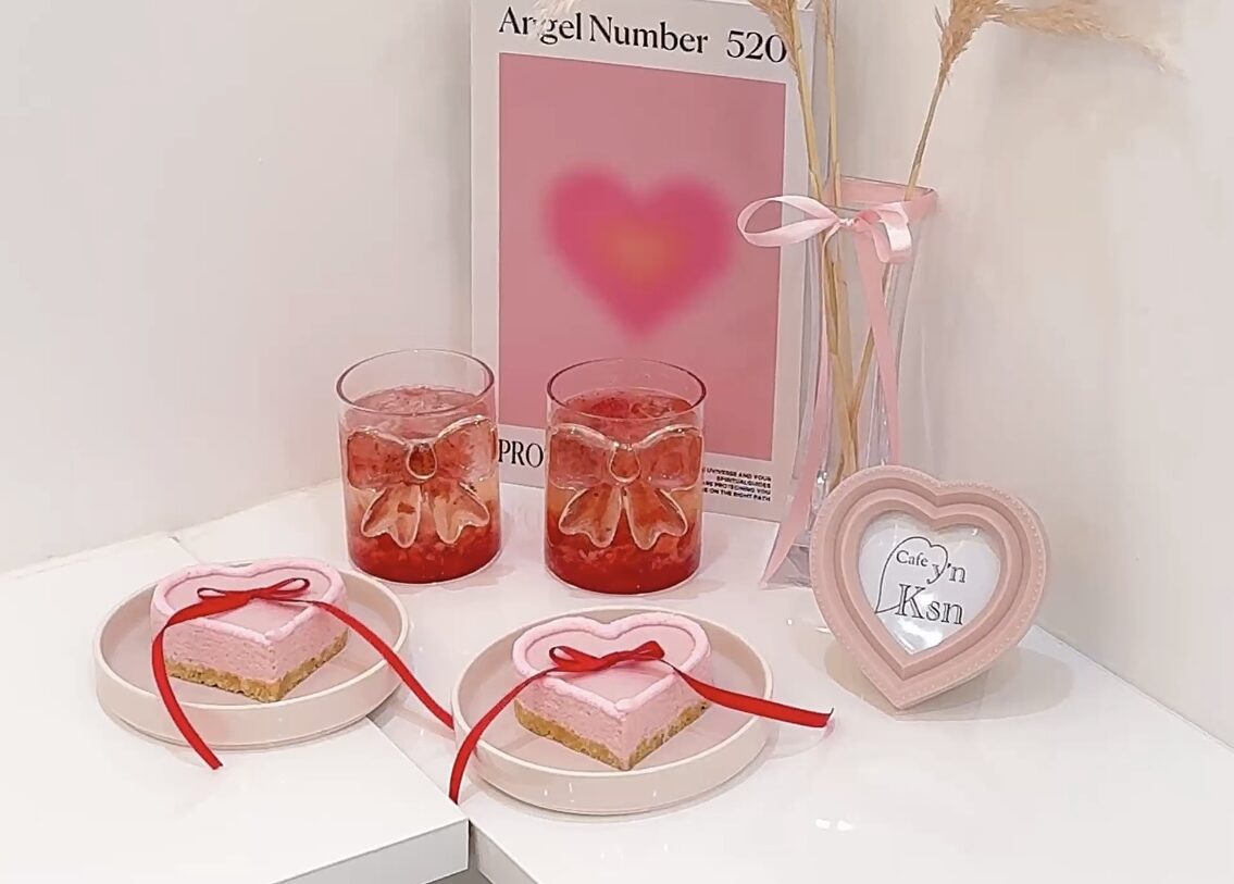 13席のお店内には、リボンをモチーフにした絵画や装飾が丁寧に配置され、バレエコアな世界観が表現されています。カウンター席も設けられているため、1人での利用もしやすく、推し活グッズを持参して撮影を楽しむ女性客の姿も多く見かけます。韓国カフェらしい洗練されたインテリアは、どの席からでも写真映えする仕上がりとなっています。