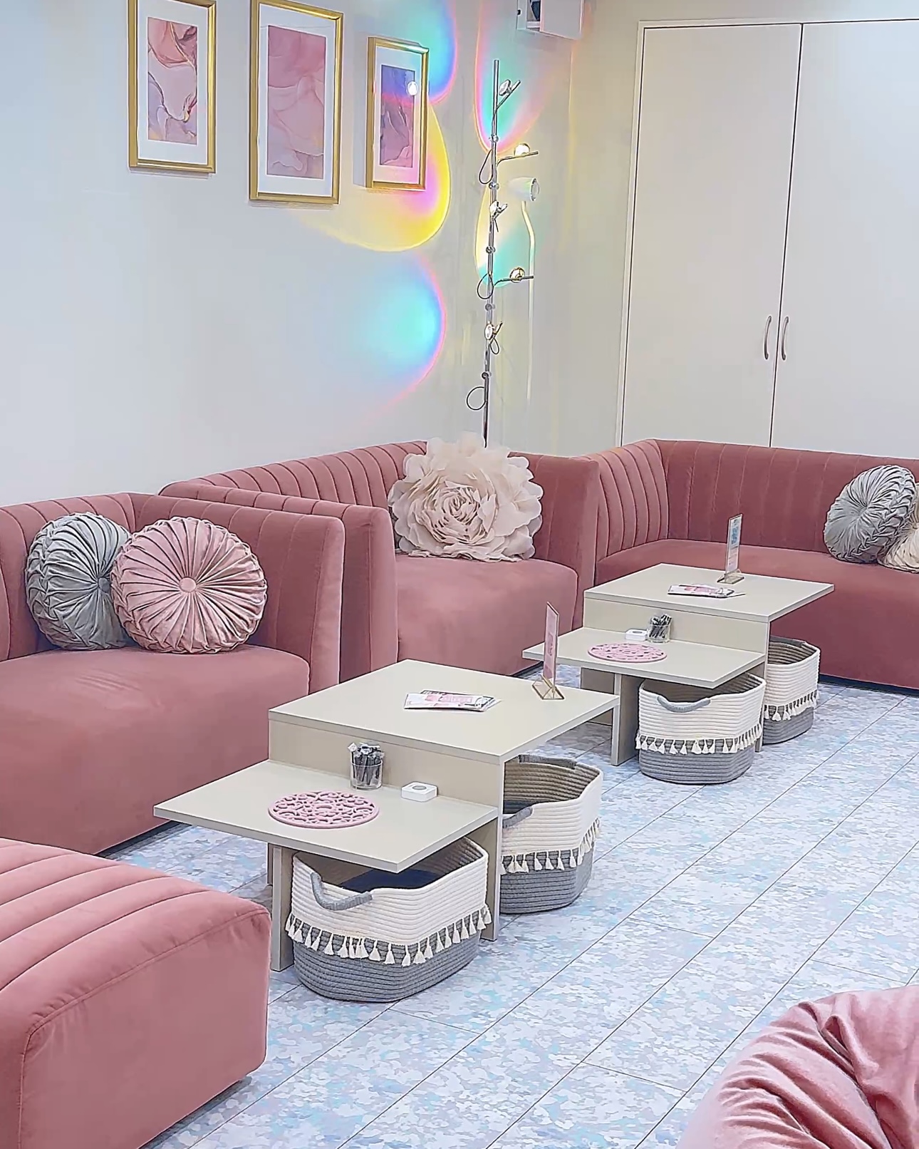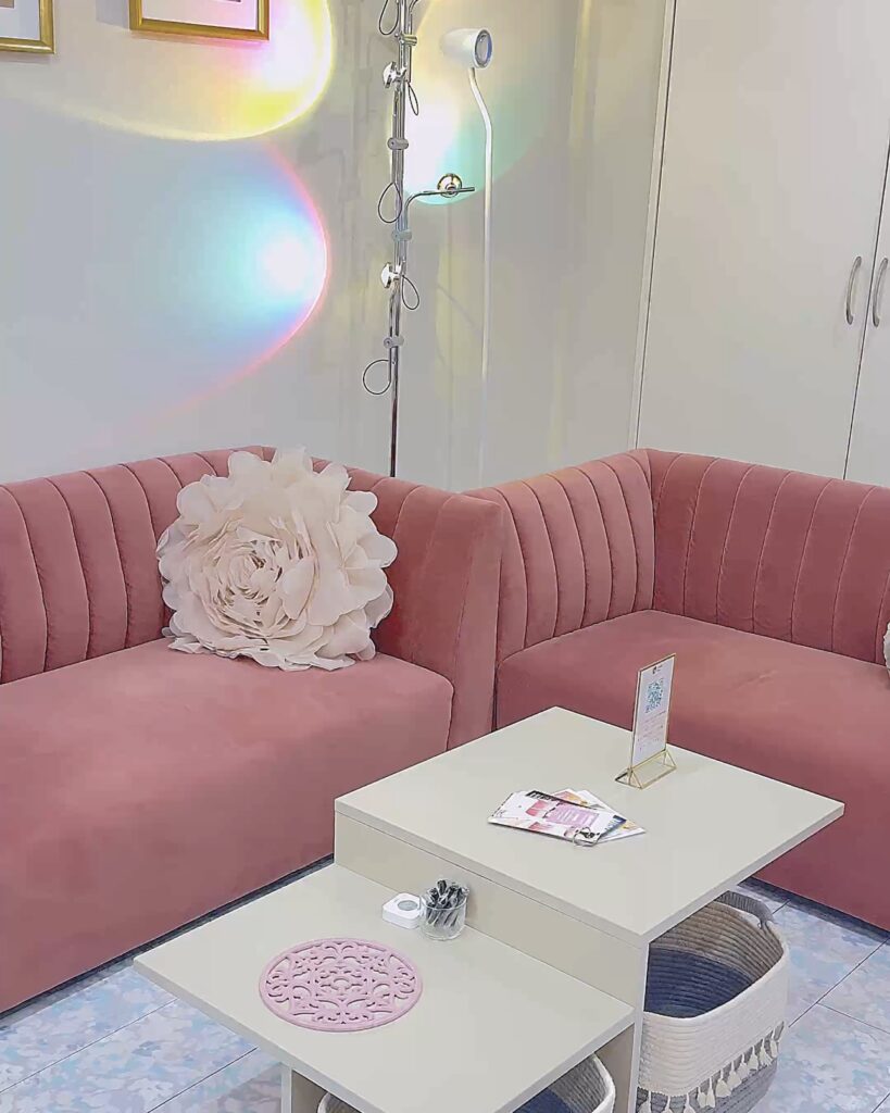 店内に一歩足を踏み入れると淡いピンクと白で統一された大人可愛い空間が広がります。靴を脱いでスリッパに履き替えるスタイルで、まるでお家のようにリラックスできる雰囲気。