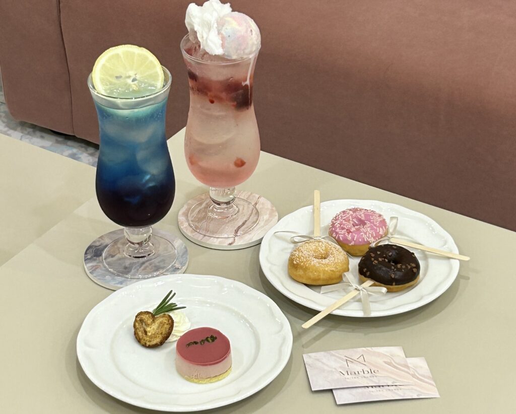 推しカラーで選べるのも嬉しいポイントです。「マイクロドーナツ3種盛り」はカラフルなリボン付きで、一口サイズながら外はカリッと中はふわふわの本格的な味わい。シーシャでは「MarbleフルーツTOPシーシャ」(パイナップル4,800円)が1日3台限定で提供され、フルーツの爽やかさとシーシャの甘い香りが絶妙にマッチ。カフェ利用だけでも十分楽しめる充実のメニューラインナップです。