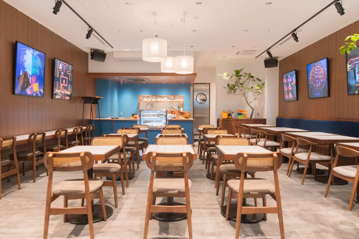店内に足を踏み入れると、まず目を引くのは壁面に飾られたアンディ・ウォーホール風のポップアートです。木材とモルタルを基調とした内装に、タイル張りのテーブルやビビッドなブルーのカウンターが映える、現代的でスタイリッシュな空間が広がっています。フォレストゲート代官山の1階に位置することもあり、店舗周辺には緑が豊富で、開放的なオープンテラス席も完備。