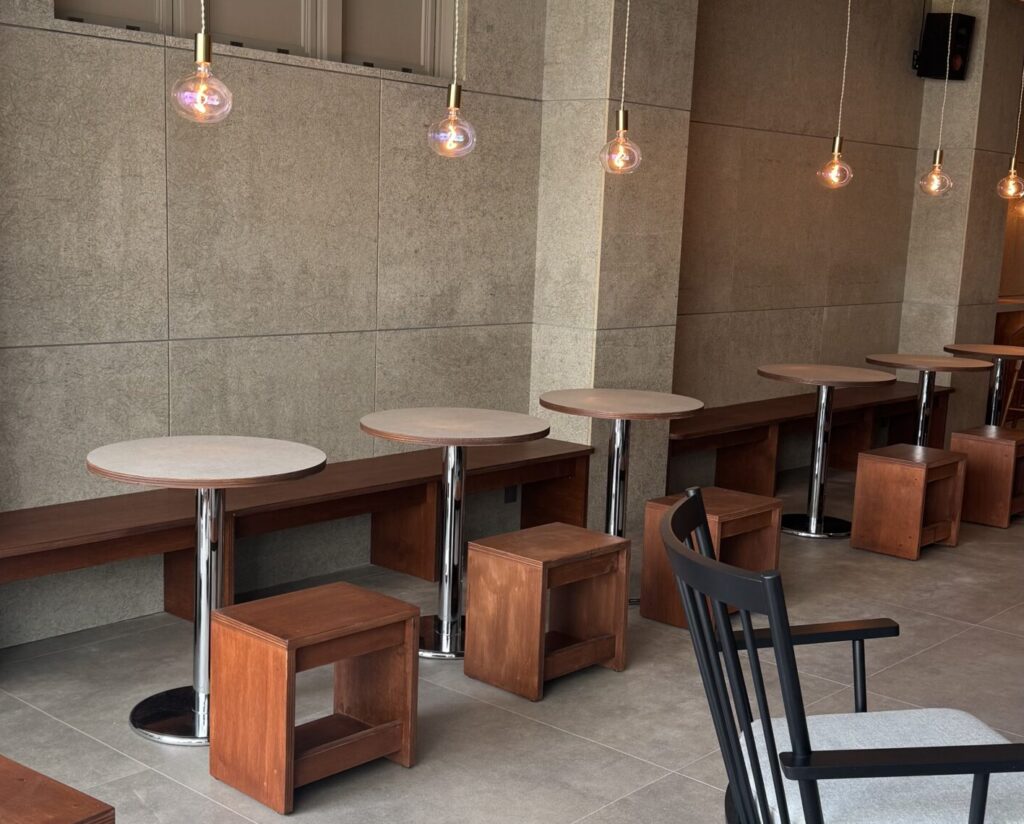 コンクリート調の壁面にミニマルな家具を配置し、洗練されたモダンな空間設計が印象的。照明も抑えめで落ち着いた雰囲気を演出しており、まるで韓国のカフェにいるような特別感を味わえます。ソファ席も用意されているため、ゆったりと過ごせる環境が整っており、電源も完備されているため作業利用にも最適です。入口がやや分かりにくい立地ですが、一度足を踏み入れると外観からは想像できないスタイリッシュな空間が広がります。