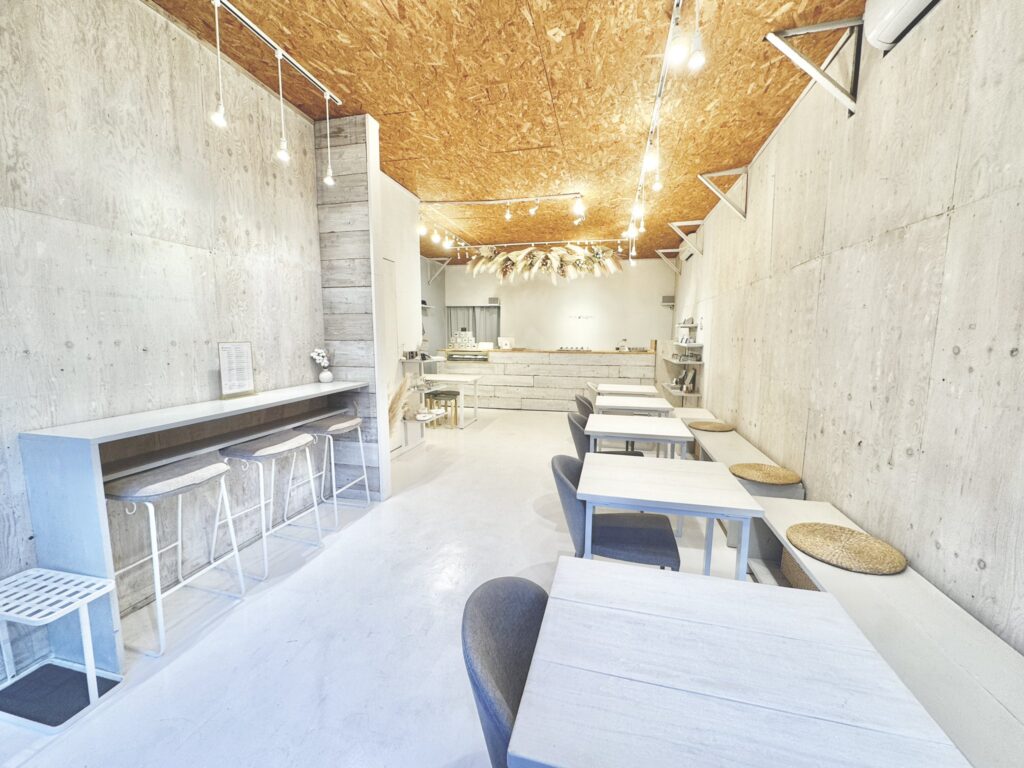 店内はモノトーンホワイトを基調としたナチュラルでおしゃれな雰囲気で、まるでギャラリーのような洗練された空間となっています。カウンター席を含めて15席ほどあり、落ち着いて過ごせます。MISONOMIとカウンターが別々になっているため、それぞれのメニューを注文しやすい造りです。一人でも入りやすい雰囲気で、ふらっと立ち寄ってテイクアウトするのにもぴったりです。