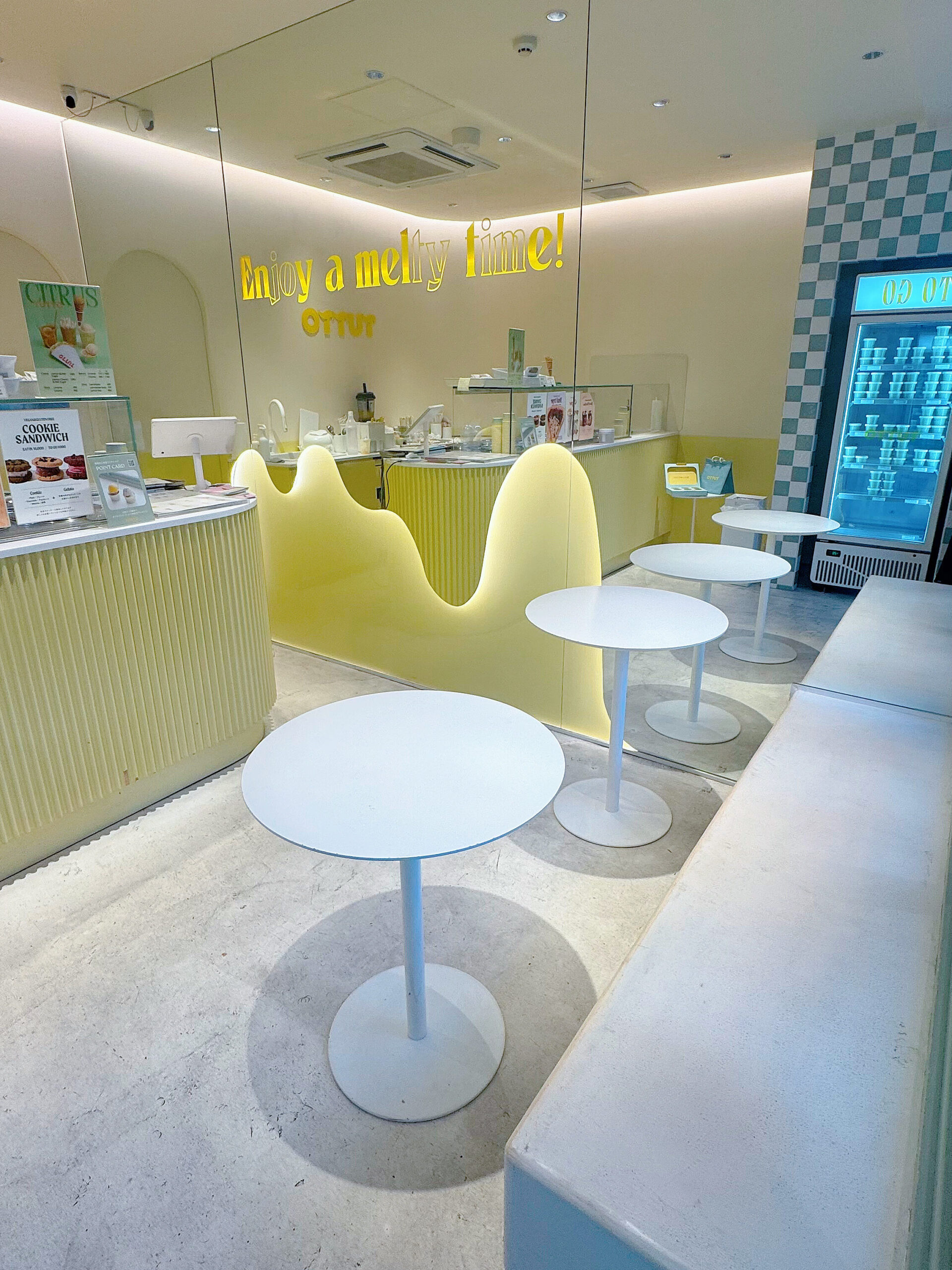 店内はパステルカラーで統一された明るくナチュラルな雰囲気で、小さなテーブルが2つほど用意されています。席数は約8席と限られていますが、テラス席もあり、犬連れでの利用も可能です。ただし、イートインを利用する場合はワンドリンクオーダー制となっているため注意が必要です。テイクアウトのお客様は比較的スムーズに購入でき、食べ歩きにも適しています。壁がガラス張りになっているため視覚的に開放感があり、おしゃれな空間で写真撮影を楽しむこともできますよ。