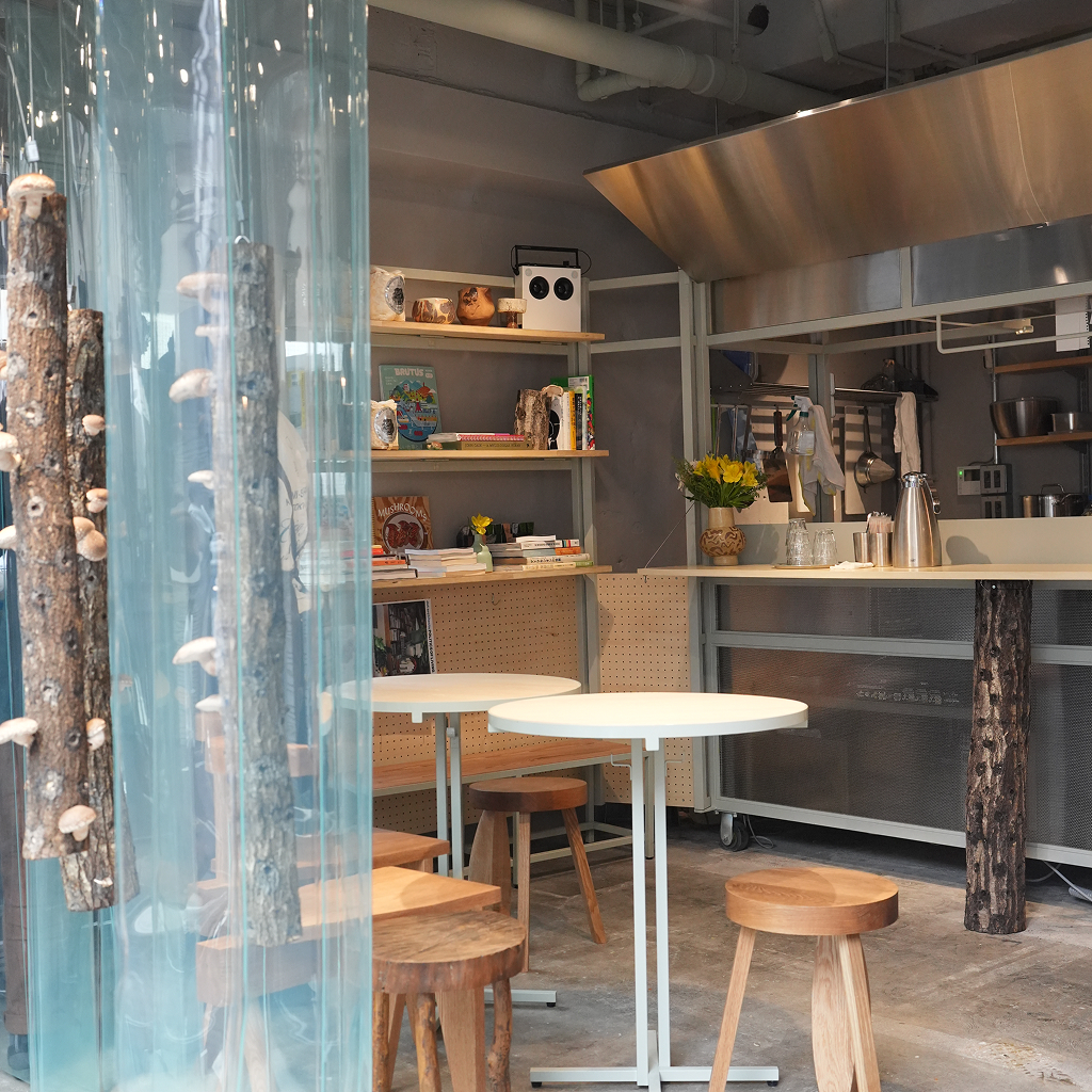 店内は10席ほどの小さな空間で、立ち席も含めたカジュアルなファストフード店のスタイルです。キノコ栽培のケースが設置されており、実際に成長するキノコを眺めながら食事ができる珍しい体験ができます。店頭には原木椎茸がニョキニョキと生えている木が置かれており、思わず見入ってしまう光景です。テイクアウトにも対応しているため、清澄白河散策のお供にするのもおすすめです。店内で食べる場合も、揚げたてのフリットを味わえるのが魅力です。