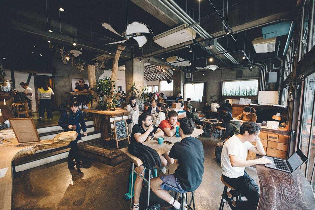 店内は天井が高く、コンクリート打ちっぱしに木材を配置したウッディでヴィンテージ調のデザインが特徴的です。大きな窓から自然光がたっぷりと差し込み、開放感あふれる空間が広がっています。流木や枯れ木などのオブジェが飾られ、店内中央には大きな木のオブジェがあるなど、遊び心ある造りになっています。座席は約52席あり、カウンター席、テーブル席、ゆったりとくつろげるソファ席、階段状になった席、スタンディングテーブルなど、さまざまなタイプの座席が用意されています。靴を脱いで足を伸ばせる席もあり、リラックスして過ごせる環境です。電源と無料Wi-Fiも完備されているため、PC作業や読書をする方も多く見られます。