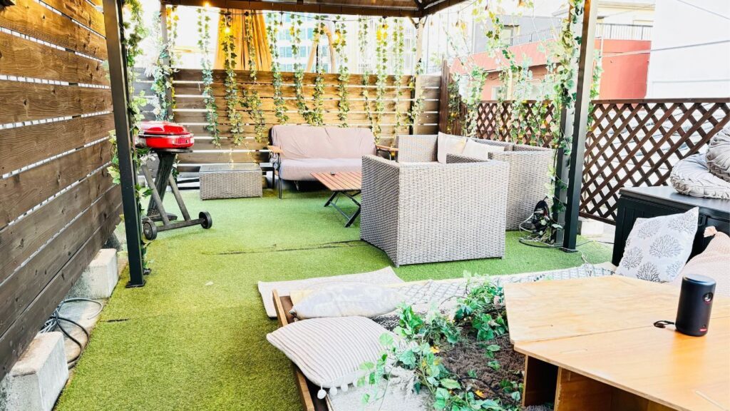 六本木一丁目駅から徒歩5分の場所にありながら、看板もなく門扉の奥に入口がある、まさに”知る人ぞ知る”隠れ家カフェ&バーです。マンションの地下に位置し、初めて訪れる方は入口を見つけるのに少し苦労するかもしれませんが、その分見つけた時のワクワク感は格別。門を開けて地下へと続く階段を降りると、北海道ニセコの別荘をテーマにした温かみのあるラグジュアリー空間が広がります。
