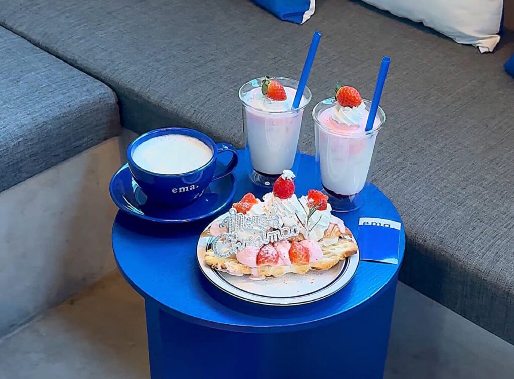新宿駅西口から徒歩5分。翌朝5時まで営業している、青と白の無機質空間が映えるカフェ。シーシャカフェですが、カフェ利用のみでもOK。