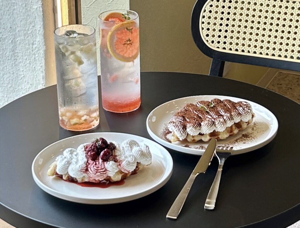 SNSで話題の本格韓国カフェ。高い天井とコンクリート調のおしゃれ空間で、店頭焼き上げのワッフルやハート型スイーツが人気です。10:00~13:00まで、モーニングメニューがあり、提供にかなり時間がかかるのも注意!テラス席もあり。