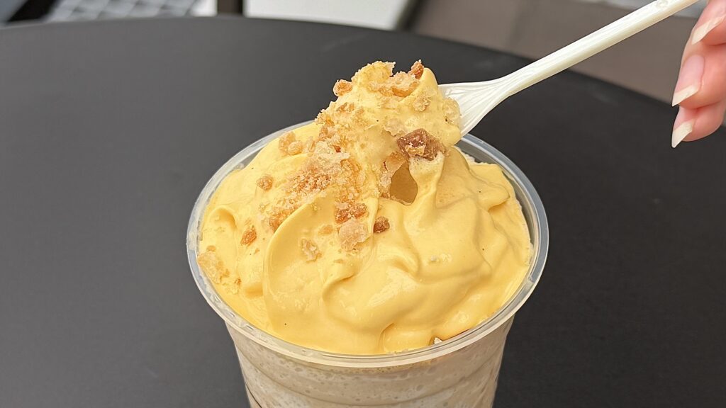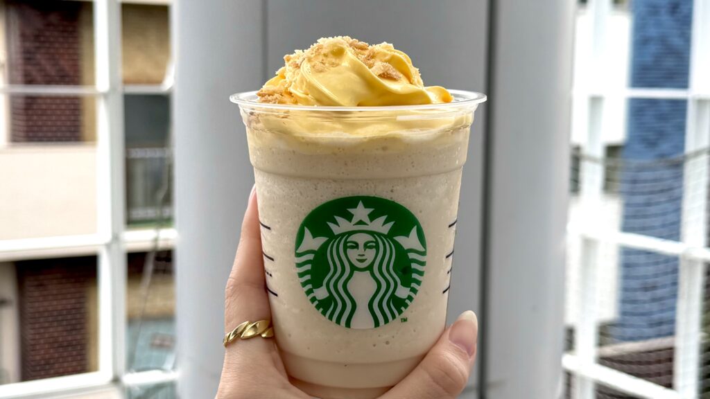 ベースはミルク+バニラ風味のミルクキャラメルソースをブレンドしたフラペチーノ。トップにはバニラビーンズと卵黄を使ったカスタードフレーバーホイップがたっぷり乗り、その上にサクサクのシュー生地風クランチがトッピングされています。カップの底にもクランチが入っているので、最後まで食感が楽しめる仕組みです。