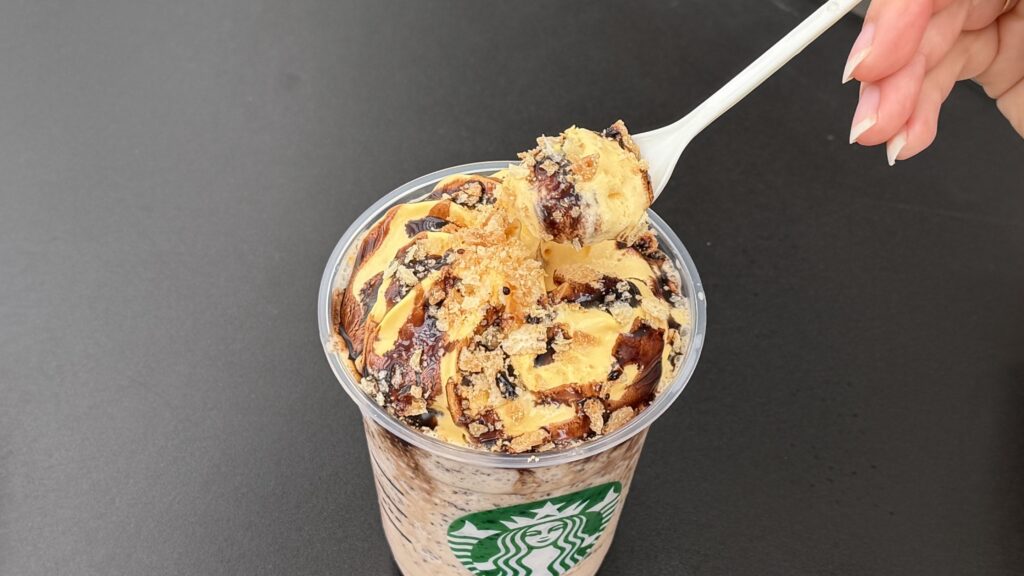 ただし、上の部分だけ食べると結構甘め。クリームとクランチをフラペチーノと混ぜながら飲むのがおすすめです。